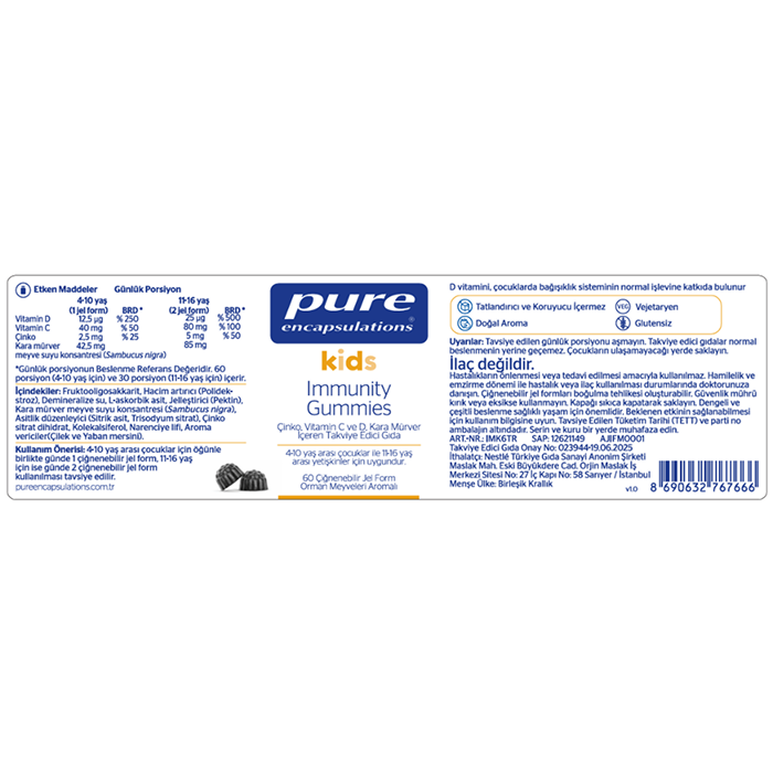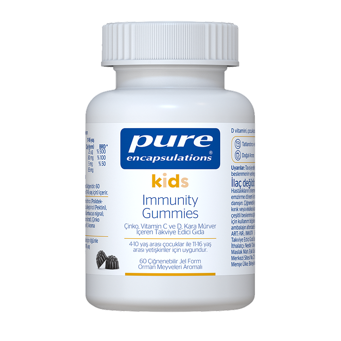 Pure Encapsulations® Kids Immunity Gummies 60 Çiğnenebilir Jel Form, 60 adet gummy içermekte olup orman meyvesi aromalıdır.